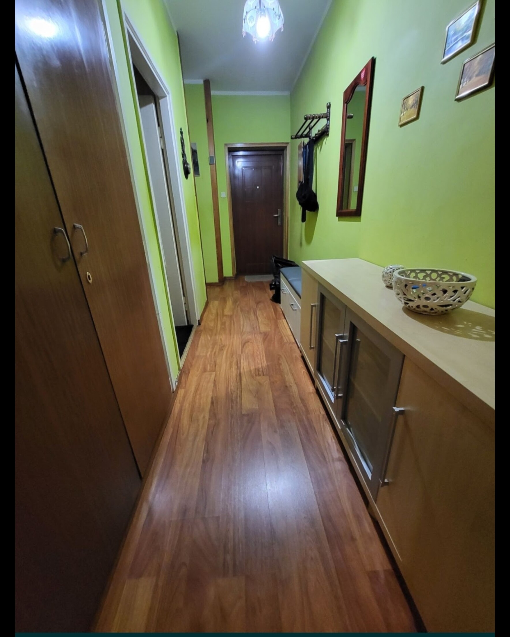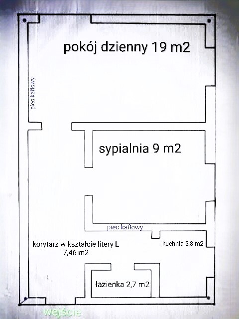 Przestronny pokój dzienny 19 m2, sypialnia 9m2, kuchnia 5,8m2, przedpokój w kształcie litery L 7,46m2, łazienka 2,7m2, balkon francuski.