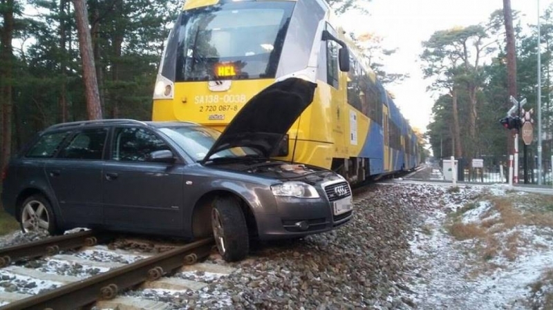 Wypadek w Juracie 18.01.2016. Audi wjechało pod pociąg jadący do Helu. Do zdarzenia doszło na niestrzeżonym przejeździe kolejowym. Jak informują policjanci, w tym zdarzeniu nikt nie ucierpiał. Więcej na: puck.naszemiasto.pl