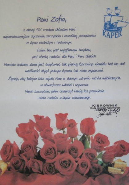 Jurata noclegi - nasza-jurata.pl - W O.S.W. Kaper w Juracie gości WYJĄTKOWA OSOBA. Jest to Pani Zofia, która obchodziła 4 września 101 urodziny. PANI ZOFIO ŻYCZYMY 200 LAT !!! — w Jurata.